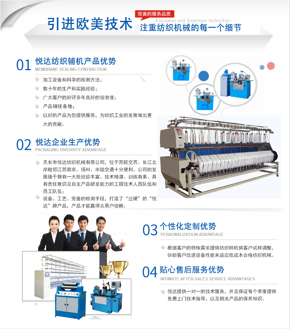 天長市悅達紡織機械有限公司座落在皖東天長市仁和集鎮人民西路88號,公司位于蘇皖交界、長江北岸毗鄰江蘇南京、揚州、水陸交通十分便利。 公司是主要生產紡織平車安裝工具、紡部輔件及配件綜合性企業。已有二十多年的生產歷史,在激烈的市場競爭中始終保持優良的質量、優化的價格、齊全的品種優勢。產品暢銷全國各地,深受新老客戶的好評。 公司以服務客戶滿足用戶為己任,不斷提高產品加工精度,拓展系列品種,以高標準、高起點滿足客戶需求。公司精神:創新、開拓、務實。公司宗旨:追求誠信、追求質量、追求服務、為用戶著想。